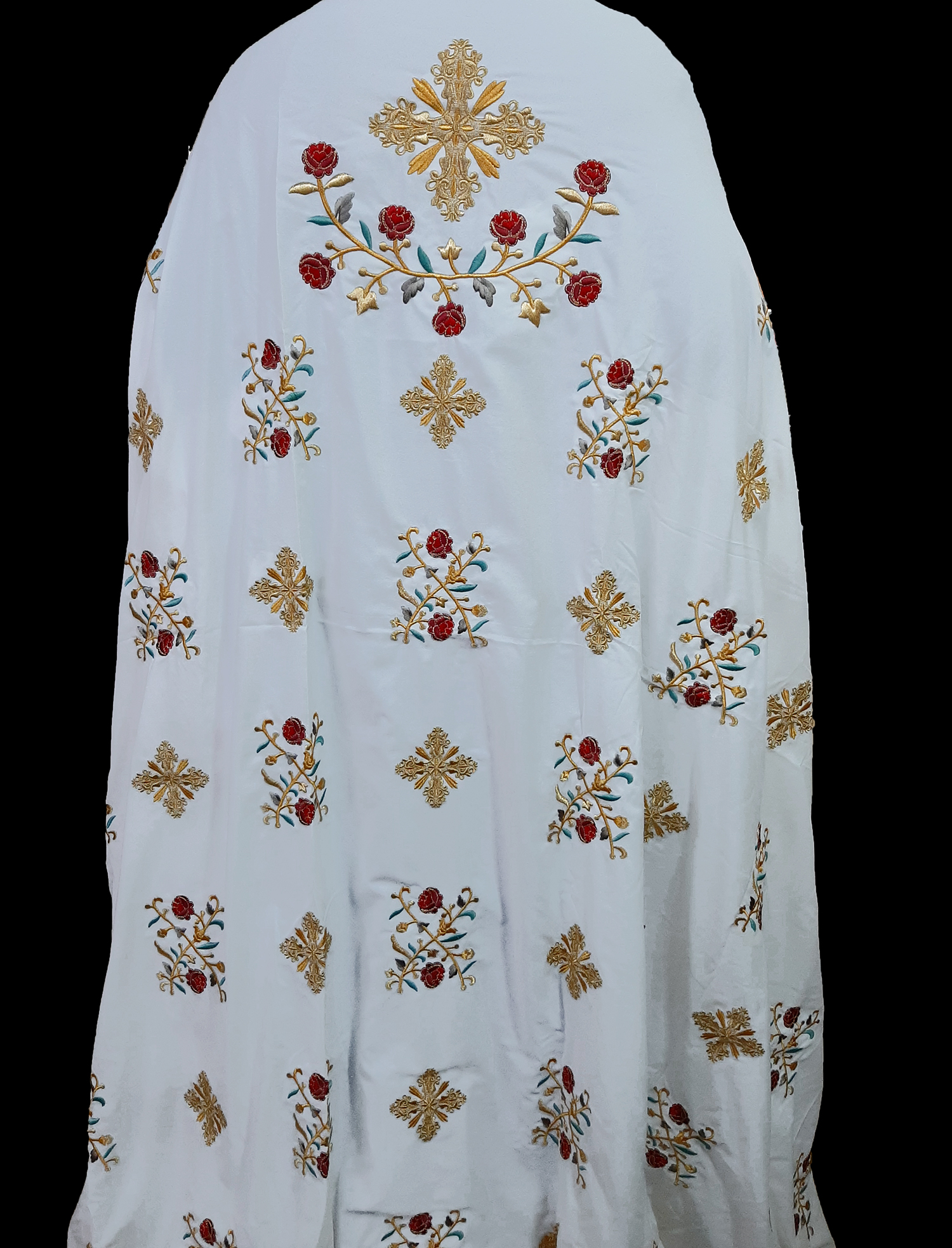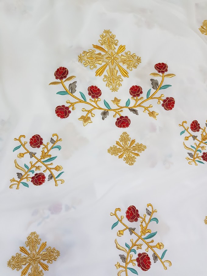 Η κεντημένη στολή αποτελείται από ένα ύφασμα όπου συμπεριλαμβάνεται το φελόνι, πετραχήλι, επιμάνικα, ζώνη και επιγονάτιο.