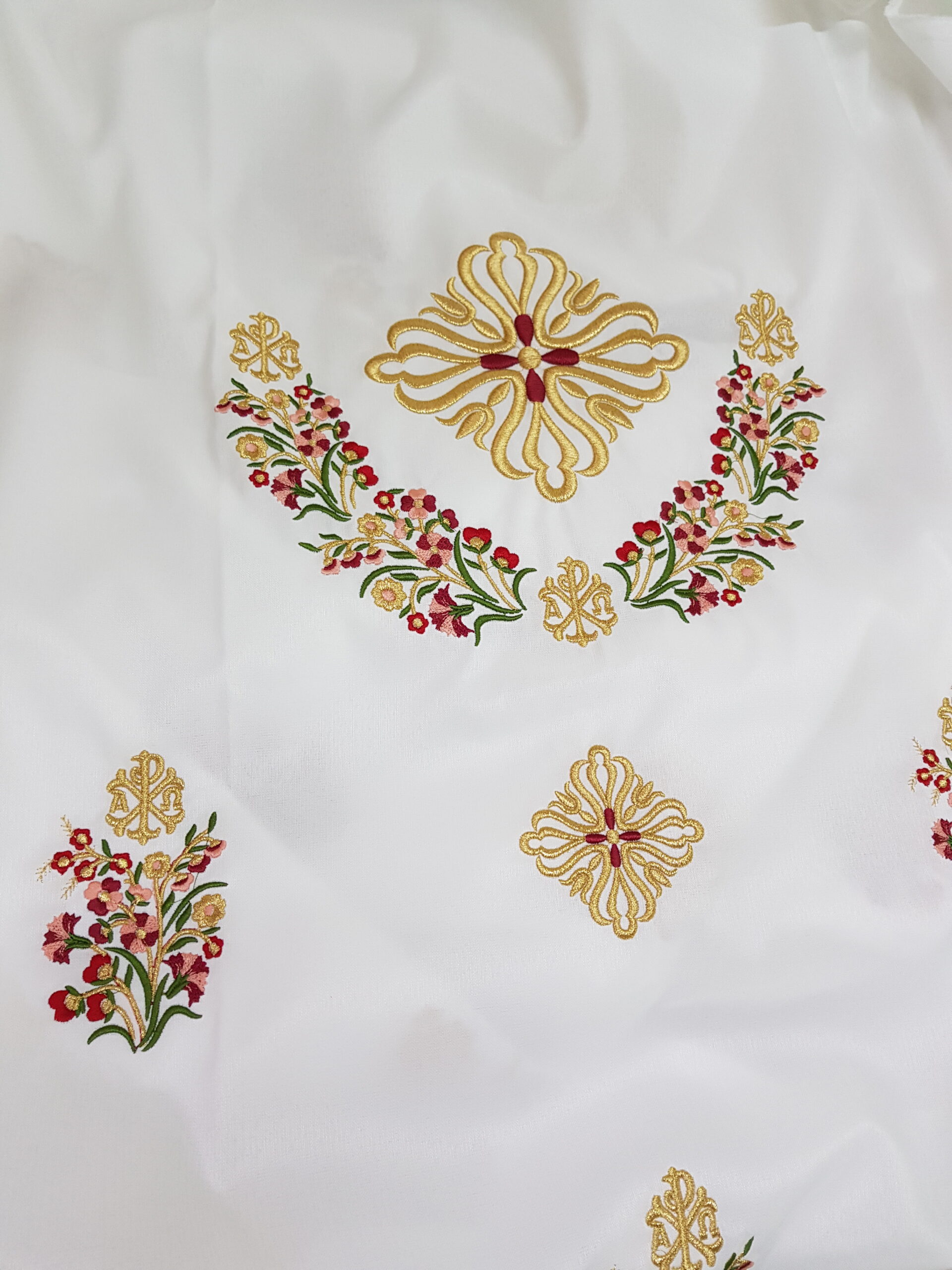 Η κεντημένη στολή αποτελείται από ένα ύφασμα όπου συμπεριλαμβάνεται το φελόνι, πετραχήλι, επιμάνικα, ζώνη και επιγονάτιο.